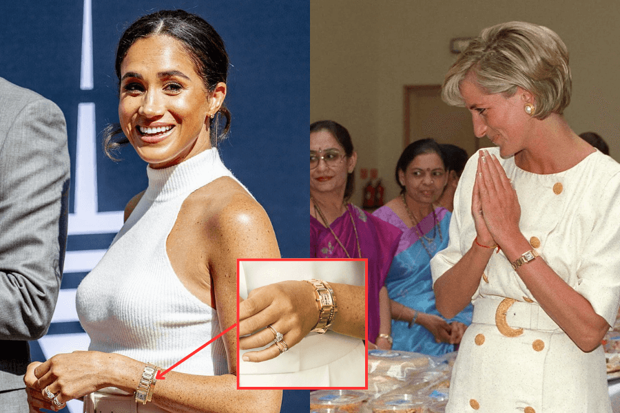 El reloj Cartier Tank Française de Meghan encierra un simbolismo complejo. Originalmente usado por la Princesa Diana, pasó de generación en generación y ahora adorna la muñeca de Meghan en apariciones y entrevistas selectas.