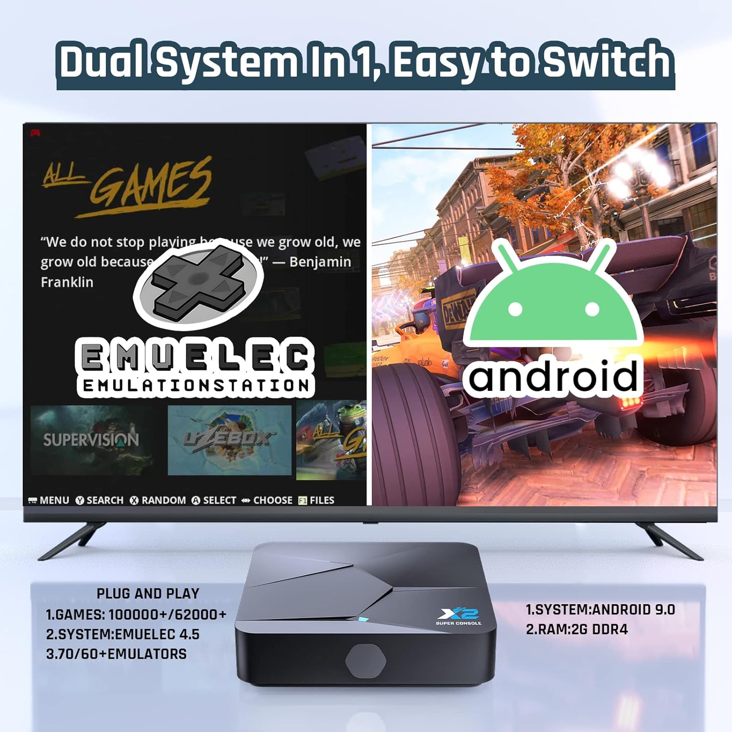 Not content with just one built-in system, the Kinhank Super Console X2 goes above and beyond with two: EmuELEC 4 and RetroArch.5 and Android TV 9.0. You can easily switch between playing games and watching TV, making it a versatile entertainment device. It is also compatible with TV, PC, laptop, and projector, giving you the flexibility to play games on your preferred device.